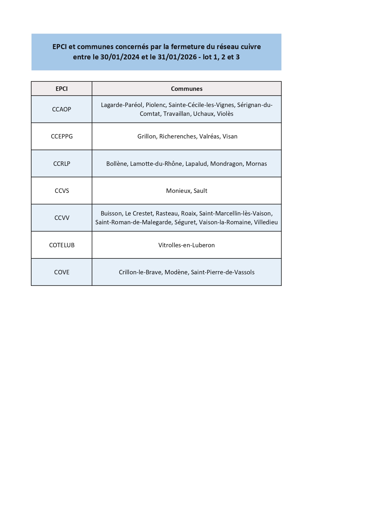 - Les EPCI et communes concerné(e)s par la fermeture du réseau cuivre entre 2024 et 2026 : cliquez ici